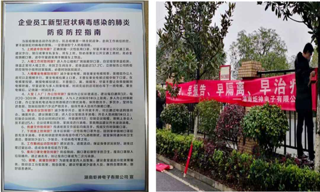 制訂疫情防控和復工方案。為確保疫情防控和經營發展兩不誤,根據郴州市委、市政府和郴州高新區指導精神,公司制定了《湖南炬神電子有限公司新型冠狀病毒感染肺炎疫情防控工作方案》、《湖南炬神電子有限公司新型冠狀病毒肺炎應急預案》,全面落實復工疫情防控的主體責任,完善疫情防控組織機構,建立“復工疫情防控準備工作”微信群,對復工后員工進出廠、工作、就餐、住宿等各項工作進行統籌安排,確保適合當前疫情防控工作的需要。